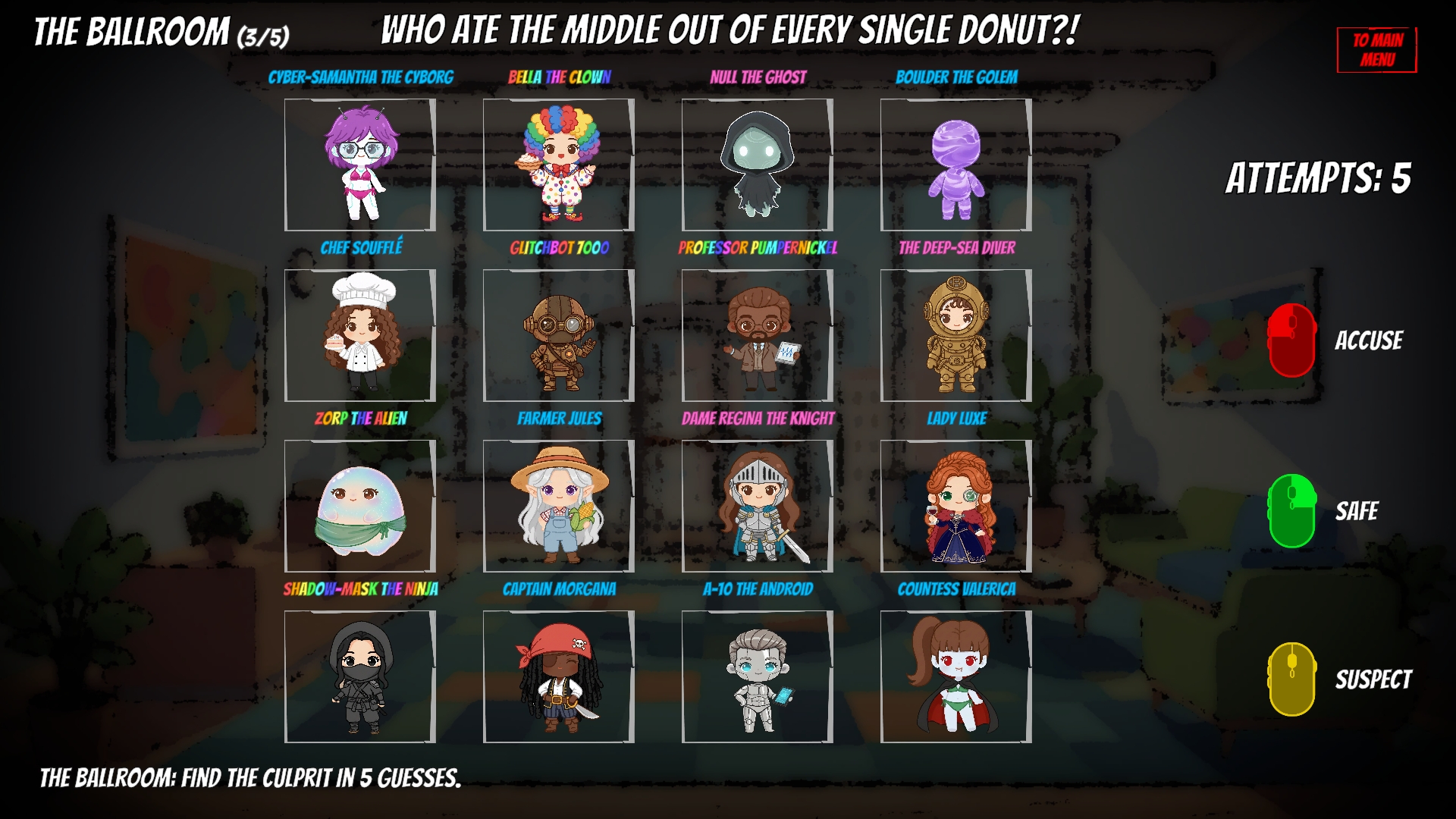 Someone in this crowd is guilty. It might be the Robot, the Cowboy, or the terrifying floating ...ball! But here’s the problem: you only have a few attempts to catch them, and you have no idea who it is.